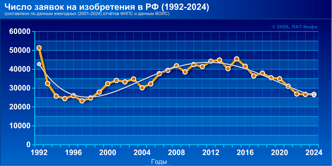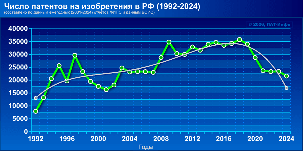 Ну, а что касается ФИПС, то “труба пониже, дым пожиже”. В чём можно убедиться просмотрев приведённые ниже “Весёлые картинки”, которые вряд ли поспособствуют особому оптимизму. Например, число патентов на изобретения, выданных ФИПСом с 2018 по 2024 гг., снизилось в 1,66 раза (с 35774 до 21608 ед.). Причём, начиная с 2015 года наблюдается устойчивый линейный тренд на снижение (в 1,7 раза) числа заявок на изобретения (с 45517 до 26698 ед.). Комментарии нужны?
