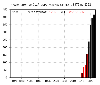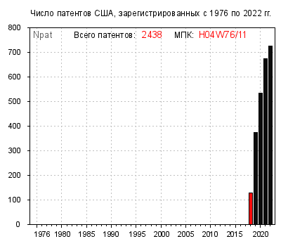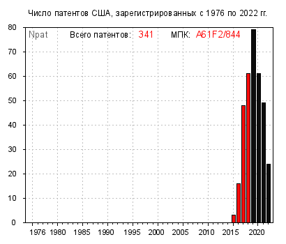 Тем не менее, среди найденного встречаются буквально “образцовые” подгруппы – просто какие-то “передовики изобретательского производства”, в которых ежегодный прирост “патентного поголовья” исчисляется сотнями. Например, A61K35/17 🔎, B33Y30/00 🔎, G16H50/20 🔎 и H04W76/11 🔎.