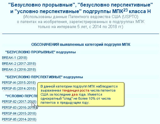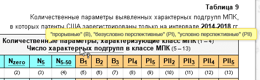 “Безусловно прорывные” подгруппы МПК обозначены как BREAK-1 (или B1), BREAK-2 (B2), BREAK-3 (B3), “безусловно перспективные” – PERSP-I4 (PI4), PERSP-I5 (PI5), “условно перспективные” – PERSP-II2 (PII2), PERSP-II3 (PII3), PERSP-II4 (PII4), PERSP-II5 (PII5).