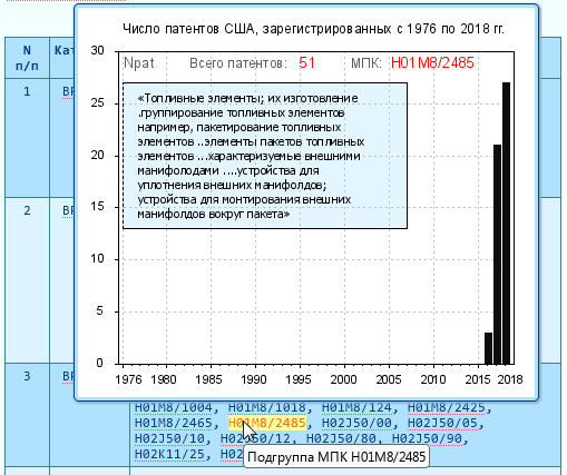 - из этих подгрупп выделяются те, в которых суммарное число зарегистрированных за эти 5 лет патентов не меньше 50 ед.1)”Красивый” “порог” в 50 патентов выбран мной несколько произвольно, исходя из своего представления о том, что называть “активно развивающимся” направлением (технологией). 10 патентов в подгруппе за 5 лет – это явно мало, а 100 – много. Так что была выбрана “золотая середина”.;