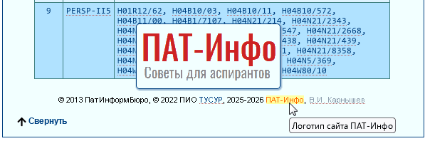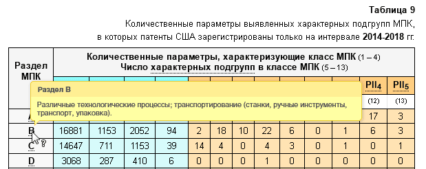 Всю информацию о найденных характерных подгруппах в интервале 2014-2018 гг. я свёл в таблицы для каждого раздела МПК. Таблица с результатами открывается при нажатии на соответствующий спойлер ➜.Подробных пояснений не требуется потому, что там, на мой взгляд, всё совершенно очевидно. Хотя три скриншота всё-таки приведу: пример 1 🔎, пример 2 🔎, пример 3 🔎.
