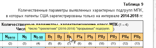 Но как говорил сын биндюжника Беня Крик5)И. Бабель. “Одесские рассказы”. “Как это делалось в Одессе”.: “… перестанем размазывать белую кашу по чистому столу’‘. В Таблицу 9 я свёл общие количественные результаты поиска (2014-2018) указанных выше характерных подгрупп, которые имеются и в 18-ой и в 23-й редакции МПК. Для удобства у каждого условного обозначения (A, B …H, Nall, Nzero, …, PII5) в Таблице имеются всплывающие подсказки (пример 1 🔎, пример 2 🔎, пример 3 🔎), поясняющие, что это за величины и обозначения.