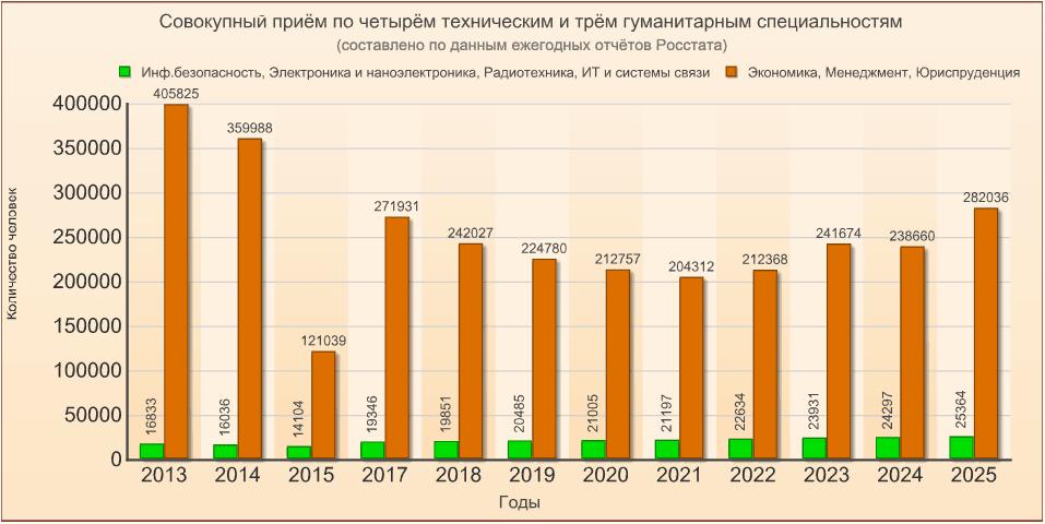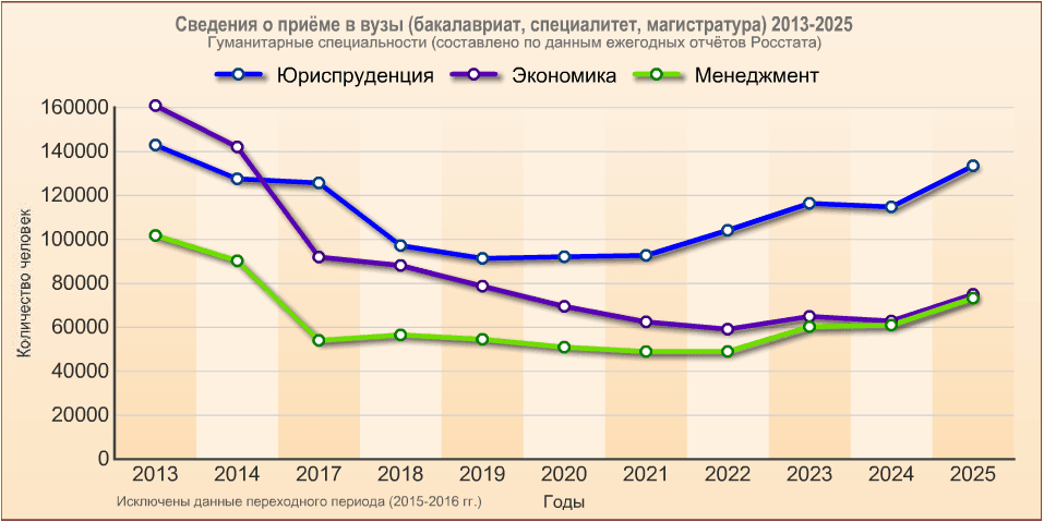 1. Динамика приёма в вузы с 2013 по 2025 годы2)Исключены данные переходного периода (2015-2016 гг.). на три гуманитарные специальности (Юриспруденция, Экономика, Менеджмент). Именно эти псевдоспециальности на мой взгляд нанесли наибольший ущерб системе высшего образования в России, создавая лишь иллюзию образования и отвлекая колоссальные ресурсы. В том числе и потому, что науки, представленные в названиях этих специальностей никакими науками, по сути, не являются, а лишь подпадают под классификацию Л.Д. Ландау3)”Науки бывают естественные, неестественные и противоестественные”. противоестественных наук.