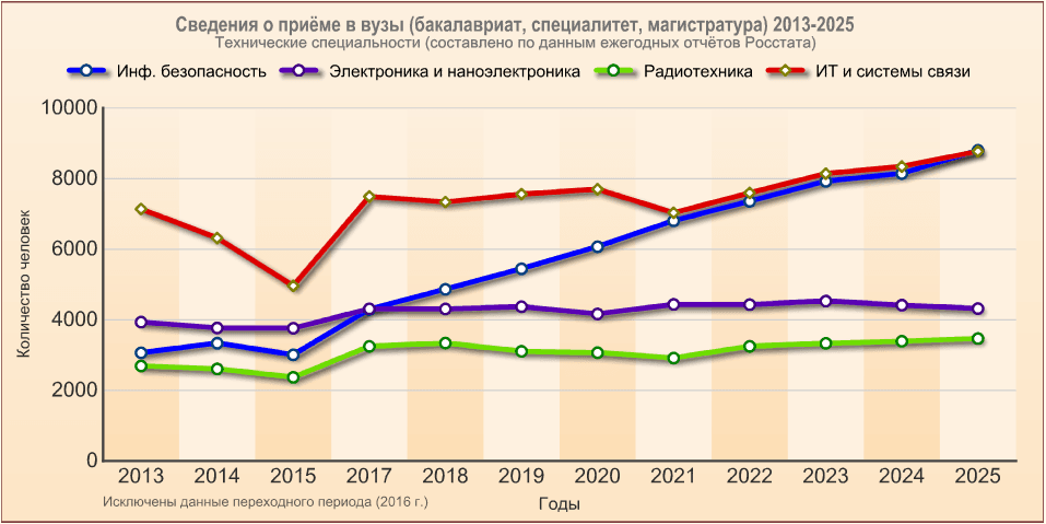 Ну, а раз Минобрнауки не посчитало возможным более подробно поделиться с гражданами перлами, содержащимися в выступлении г-на министра, то я решил несколько восполнить пробел. Для этого я скачал ежегодные отчёты формы федерального статистического наблюдения ВПО-1 с 2013 по 2025 годы, и вытащил оттуда данные о приёме в вузы по образовательным программам высшего образования (бакалавриат, специалитет, магистратура) для ряда специальностей. И представил всё это великолепие в виде трёх диаграмм.