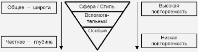 Глубина и широта ключевого слова. Специальные ключевые слова находятся в нижней части перевернутого треугольника. Общие ключевые слова – в его верхней части. Принцип от "общего-к-частному" коррелирует с частотой использования научного ключевого слова. "Глубина" и "широта" ключевого слова не являются неотъемлемыми свойствами самого слова, а зависят, скорее, от частоты использования этих слов в журнале, в котором опубликована работа. Например, тот, кто читает журнал "Science", может посчитать термин "наношаблон" (nanopattern) весьма специфическим, тогда как читатель "Журнала передовых материалов" (Journal of Advanced Materials) сочтет его вполне банальным. Кругозор читателя также влияет на восприятие уровня ключевого слова: чем меньше он разбирается в чём-то, тем больше общие ключевые слова будут казаться ему специальными, и наоборот.