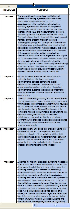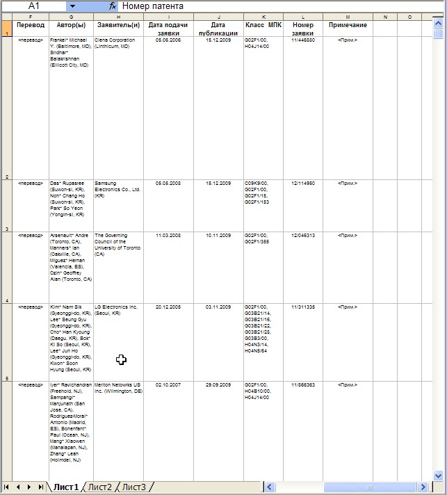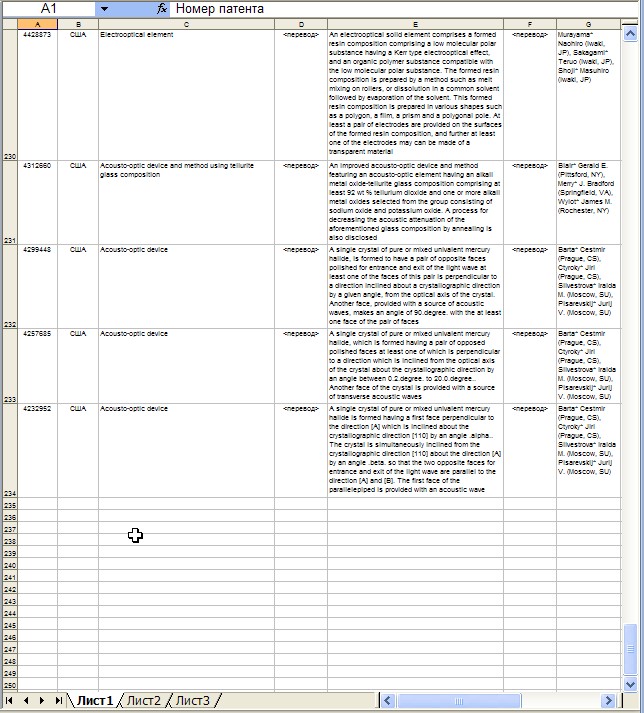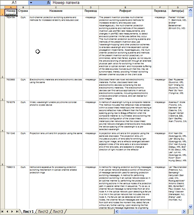 На открывшимся перед взором большом листе лицезреем сводную информацию о найденных патентах, разбитую на следующие поля: "Номер патента", "Страна" (можно выкинуть, поскольку речь идет о патентной базе США), "Название", "Перевод", "Реферат", "Перевод", "Автор(ы)",