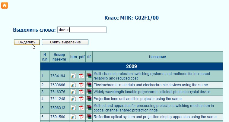 В открывшемся списке можем выделить нужные слова в названиях патентов, например, "device".