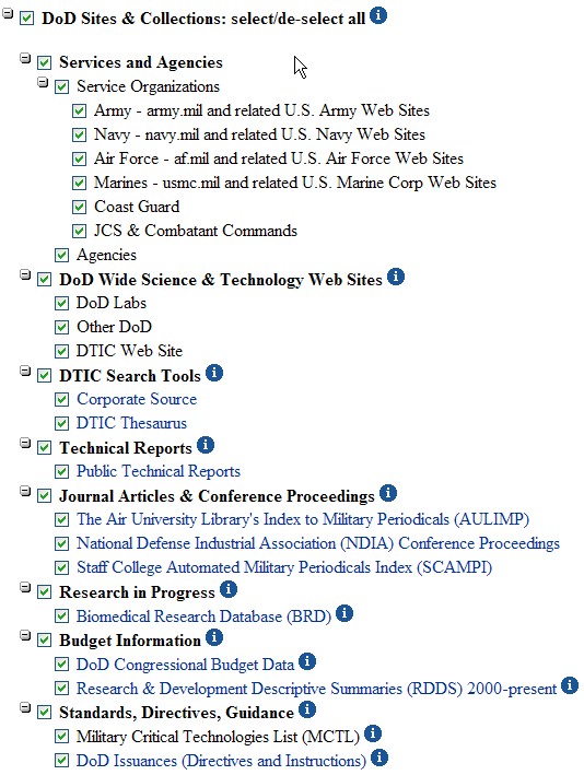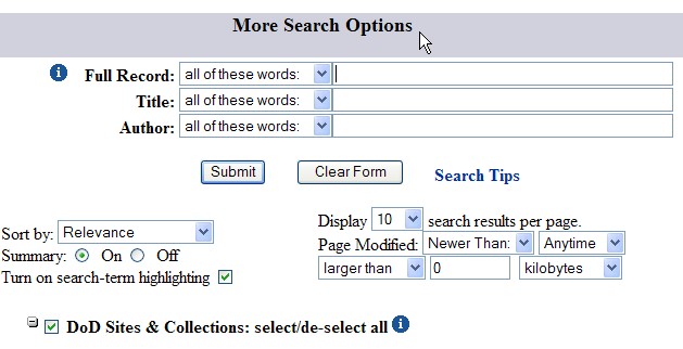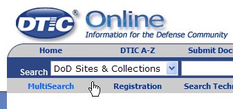 По умолчанию поиск производится по всем открытым сайтам и хранилищам документов Минобороны США ("DoD Sites & Collections") (рис. 6). Можно порыться в технических отчётах ("Technical Reports"), на самом сайте ("DTIC Web Site"), или воспользоваться опцией "MultiSearch". Лично я исходную область поиска не изменяю – пользуюсь "DoD Sites & Collections".
