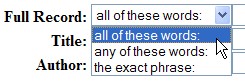 В режиме "Full Record" можно искать публикации, в тексте которых имеются ВСЕ заданные ключевые слова ("all of these words"), ЛЮБОЕ из заданных ключевых слов ("any of these words"), или ТОЧНАЯ ФРАЗА ("the exact phrase") (рис. 10).