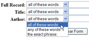 Можно искать по ключевым словам во всём материале ("Full Record"), только в названии ("Title") или по имени автора ("Author").