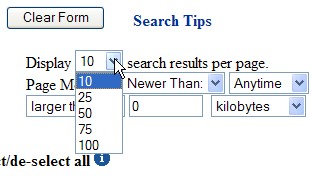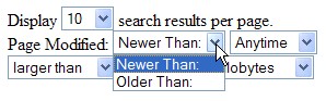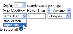 Можно задать размер искомых документов ("больше" ("larger than") или "меньше" ("smaller than"), чем заданная величина в байтах ("bytes"), килобайтах ("kilobytes") или мегабайтах ("megabytes")), информацию о которых следует выводить на странице (рис. 14).