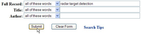 Запускаем пробный шар. Посмотрим, что найдётся в буржуйских кладовых при вводе ключевых слов "radar target detection". Для этого нажимаем волшебную кнопочку "Послать" ("Submit") (рис. 19).