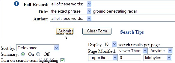 Предположим, что нас интересуют документы с вражеского сайта, в названиях которых встречается точная фраза "ground penetrating radar" ("подповерхностный радар"). Открываем страницу поиска. Выбираем опцию "the exact phrase" и вбиваем нерусские слова "ground penetrating radar" в строку "Title" (рис. 21). После этого жмём кнопку "Submit".