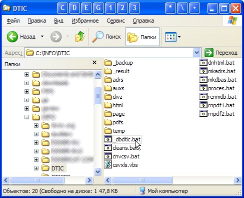 Открываем в Проводнике папку "c:\info\dtic\" (рис. 26). Находим острым аспирантским взором файл "_dbdtic.bat" и щёлкаем по нему два разА. После этого звучит команда "Вольно! Можно оправиться и закурить!". Некурящие могут прослушать радиопередачу "В рабочий полдень", пока процесс (см. рис. 27 – 31) не закончится бодрым пиликаньем системного динамика.