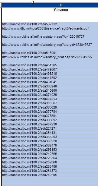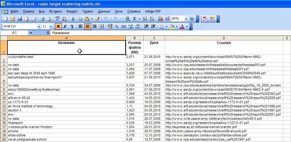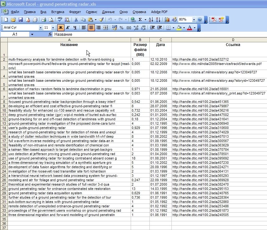 "Выдернутая" информация сгруппирована по четырём столбцам: "Название", "Размер файла в Мб", "Дата" и абсолютная "Ссылка" на pdf-файл. Названия файлов в первом столбце "обрезаны" из-за формата представления в базе данных "DTIC". Это не страшно. Кто ищет, тот всегда поймёт.