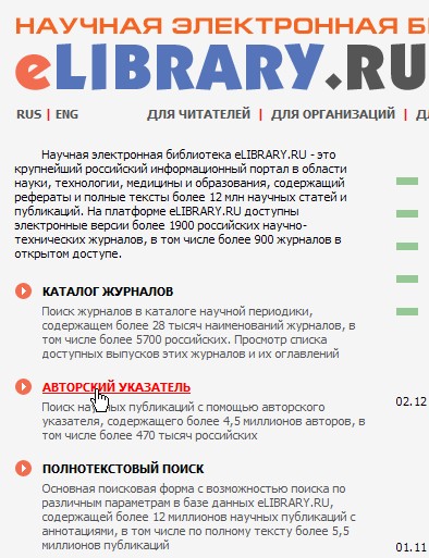 Кому интересно, может прочитать про мощь и удаль отечественной библиографической базы данных по научной периодике (рис. 2). Мы же зашли по делу, поэтому щёлкаем по пункту меню "АВТОРСКИЙ УКАЗАТЕЛЬ".