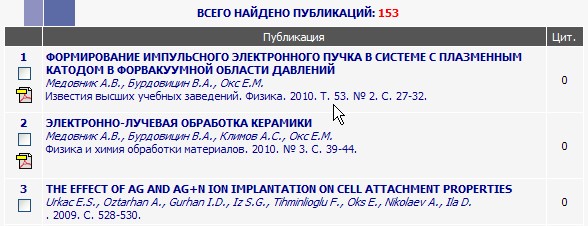 Спустя некоторое время перед вами откроется список найденных публикаций (рис. 8). По умолчанию, выдаётся результат, отсортированный по числу цитирований. Поэтому на первом месте оказывается статья Окса "Ion Charge State Distributions in High Current Vacuum Arc Plasmas in a Magnetic Field", опубликованная в 1996 году в "нехилом" журнале "IEEE Transactions on Plasma Science".