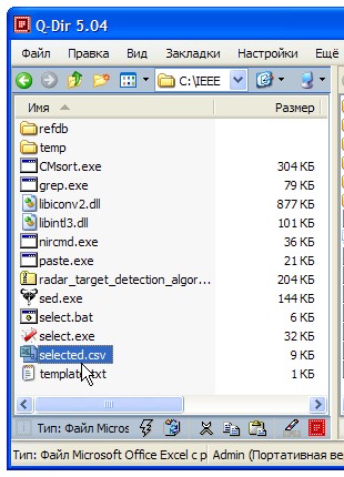 Через доли секунды в папке "C:\IEEE" появляется "результат" – файл "selected.csv" с результатами поиска, содержащий модифицированный файл базы данных рефератов с шестью записями (строками), найденными в четырёх файлах БД в папке "refdb". Единственное отличие: к имевшимся 14-ти полям добавлены поля "Имя файла" и "Номер строки".